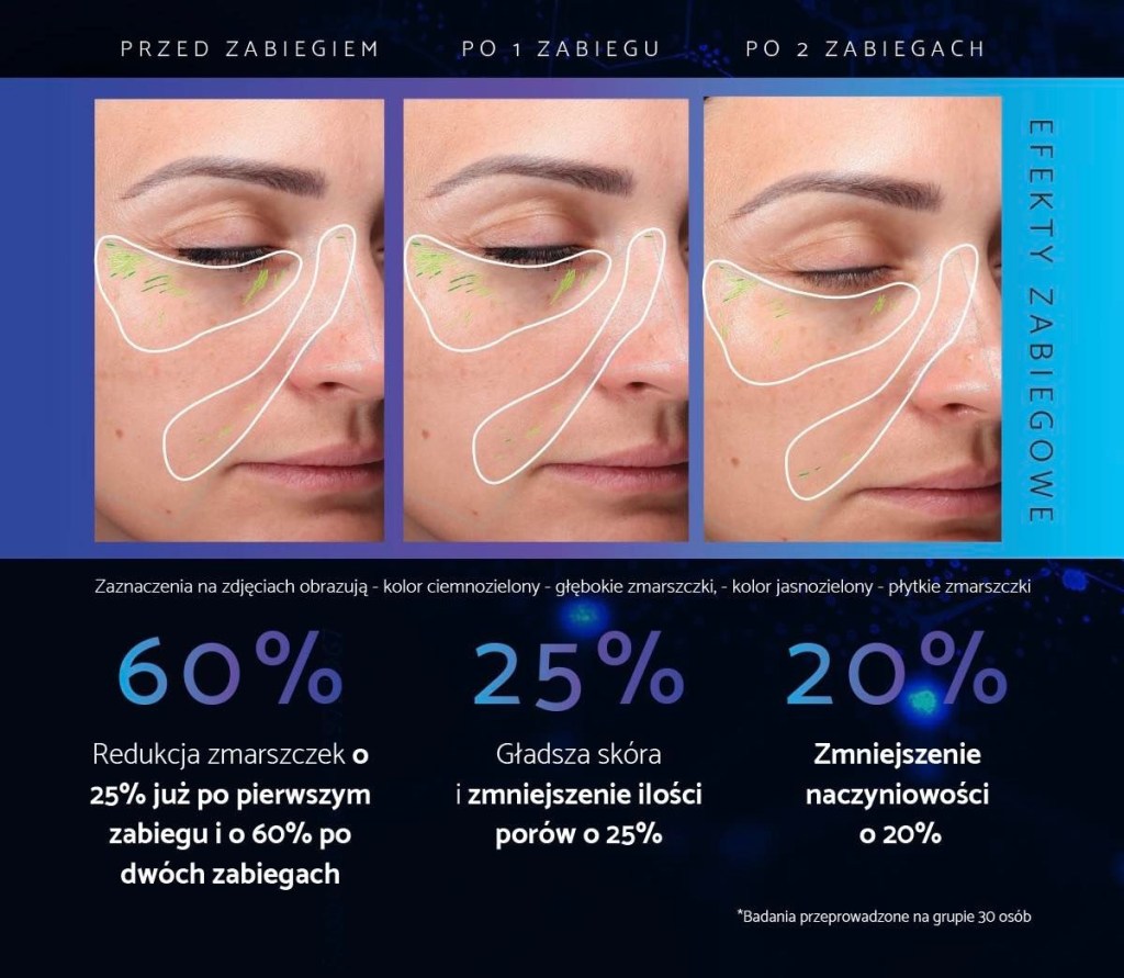 W szczególności zmarszczki spłycają się, przebarwienia rozjaśniają , skóra napina się oraz podnosi się kontur.
